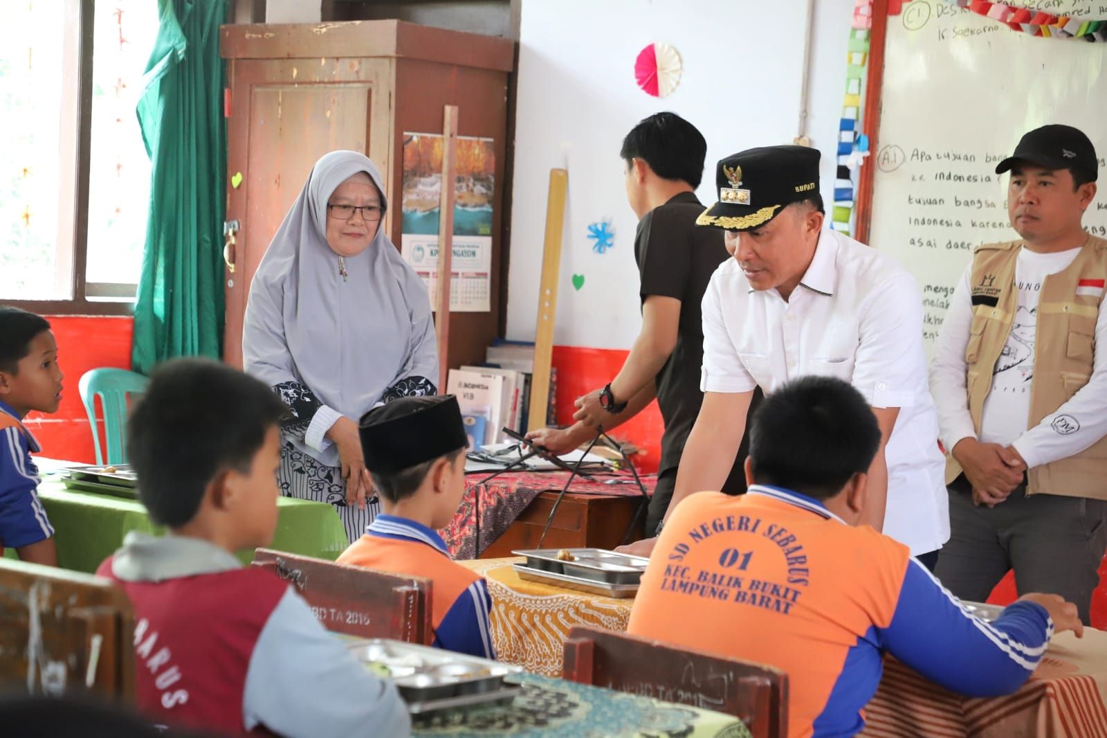 tribratanews.lampung.polri.go.id Lampung Barat – Polsek Balik Bukit melaksanakan pengamanan kegiatan Bupati Lampung Barat, H. Parosil Mabsus, S.Pd., yang meninjau langsung pelaksanaan pendistribusian Makan Bergizi Gratis (MBG) di SDN 1 Sebarus, Kecamatan Balik Bukit, Jumat (03/10/2025) sekitar pukul 10.00 WIB.Dalam kegiatan tersebut, Bupati Lampung Barat didampingi oleh Kepala Dinas Kesehatan Pemkab Lampung Barat, dr. Widyamoko Kurniawan, Sp.B., Camat Balik Bukit, Juremiyudi, S.H., M.M., Kasi Trantib Kecamatan Balik Bukit, Mawardi, Kepala Sekolah SDN 1 Sebarus, Darlin, S.Pd., serta dewan guru SDN 1 Sebarus. Peninjauan dilakukan untuk memastikan penyaluran program MBG berjalan lancar, sesuai prosedur, dan memenuhi standar kesehatan. Hal ini menyusul maraknya pemberitaan mengenai permasalahan kualitas makanan bergizi gratis di beberapa daerah. Dalam kesempatan tersebut, Bupati Parosil Mabsus juga berdialog langsung dengan siswa-siswi penerima manfaat MBG. Ia menanyakan apakah terdapat kendala, kekurangan, atau masukan terkait makanan yang diterima. “Jika ada makanan yang tidak layak konsumsi, seperti nasi lembek, berbau, atau terasa asam, saya minta kepada anak-anakku jangan dipaksakan untuk dimakan. Lebih baik jangan dikonsumsi karena dikhawatirkan sudah terkontaminasi bakteri,” tegas Bupati. Dari hasil pemantauan, pelaksanaan program MBG di wilayah Lampung Barat dinilai berjalan sesuai prosedur. Namun, Bupati menekankan pentingnya koordinasi serta pengawasan ketat terhadap kualitas makanan yang didistribusikan. Ia juga meminta pihak sekolah penerima manfaat untuk menyiapkan lap tangan atau tisu bagi siswa demi menjaga kebersihan. Kapolres Lampung Barat, AKBP Rinaldo Aser, S.H., S.I.K., M.Si., melalui Kapolsek Balik Bukit, IPTU Sabtudin, mengatakan bahwa pihaknya mendukung penuh jalannya program pemerintah daerah, termasuk dalam pengamanan kegiatan kunjungan Bupati. “Polsek Balik Bukit akan terus memastikan setiap kegiatan berjalan aman dan lancar. Kehadiran kami merupakan wujud dukungan terhadap program pemerintah yang bertujuan meningkatkan kesejahteraan masyarakat, khususnya anak-anak sekolah,” ungkap IPTU Sabtudin.(humas)