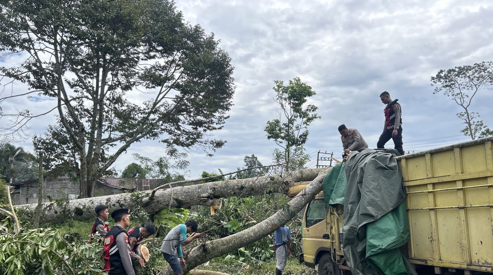 tribratanews.lampung.polri.go.id Lampung Barat – Satuan Samapta (Satsamapta) Polres Lampung Barat bergerak cepat melakukan evakuasi pohon tumbang yang menimpa sebuah truk pengangkut barang, pada Selasa (30/9/2025) sekitar pukul 10.00 WIB.Kapolres Lampung Barat, AKBP Rinaldo Aser, S.H., S.I.K., M.Si., melalui Kasat Samapta, IPTU Mahmudi, S.H., mengatakan bahwa kejadian tersebut sempat menghambat arus lalu lintas dan membahayakan pengguna jalan yang melintas. “Personel Satsamapta langsung kami turunkan untuk melakukan evakuasi pohon tumbang. Berkat kesigapan anggota di lapangan, proses evakuasi berjalan lancar dan kendaraan yang tertimpa dapat segera diamankan,” ujar IPTU Mahmudi. Ia menambahkan, tidak ada korban jiwa dalam peristiwa tersebut. Namun, bagian atas truk mengalami kerusakan akibat tertimpa batang pohon. Polres Lampung Barat mengimbau masyarakat agar tetap waspada, terutama saat melintas di jalanan yang rawan pohon tumbang, mengingat kondisi cuaca di wilayah Lampung Barat kerap dilanda hujan deras dan angin kencang.(humas)
